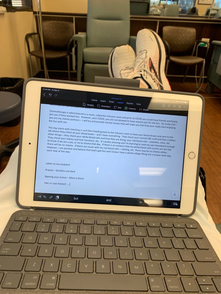 Chemotherapy is administered in a room, called the Infusion room, and prior to COVID, you could have friends and family join you if they wanted to. However, post-COVID, you are not allowed to have anyone join for the fun. So, lucky y’all – you are my chemo partners – I will try and provide mental visuals that will make you feel that you’re really here enjoying the fun with me.