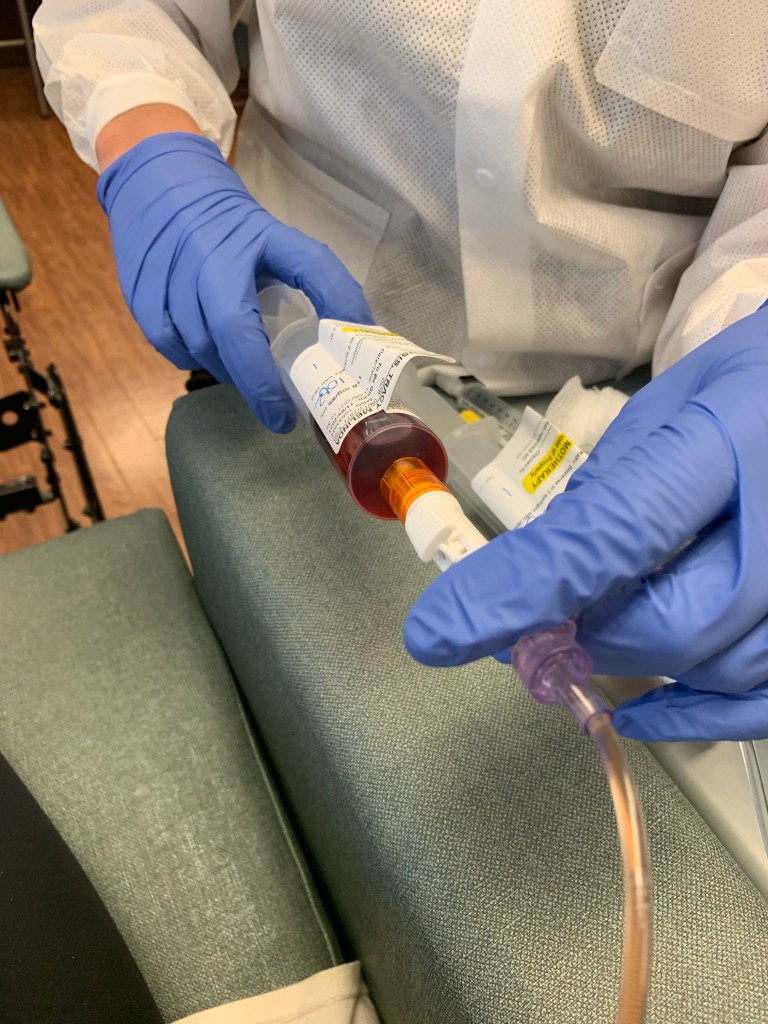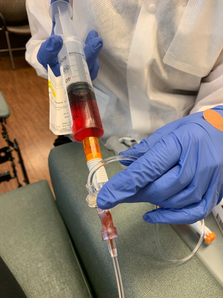 Chemotherapy starts with a steroid drip (approximately 20 minutes), then the long-acting anti-nausea medicine (approximately 30 minutes), then Cytoxan, the first chemo drug (approximately 1 hour), and then the second chemo drug, Adriamycin (15 minutes or so). Side note – Adriamycin is notoriously referred to as “Red Devil” or “Red Death”. I have re-named this drug to be “Red Delight” because it’s doing its job fighting and killing my cancer and that is delightful. This drug has been around since the early ’70s and has gotten a bad wrap since then because of the side effects with nausea, hair loss, etc. However, since then the medical field is MUCH better at preventing the side effects as best they can and adjusting when and if needed. Red Delight has to be pushed through syringes because it’s so powerful that it will cause damage to the IV bags and the nurse is required to have a special jacket and gloves while pushing this dose as it can burn the skin if it were to drip on their skin. My nurse, Brandi, always comes out in her hazmat suit to administer this dose. I feel bad for her, however, it makes me think “Why does she get all that to protect her, while I get to sit here and watch this being injected into my body….” We will classify that under random thoughts and things that make you go Hmm…. And maybe another blog post. We’ll see….